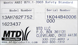 | Here's what an MTD model number sticker looks like. Remember there are two model numbers, one for the engine and one for the machine itself. This one could be found under the seat of a lawntractor or between the handles on a snowblower. ~ ~ ~ ~ ~ ~ ~ ~ ~ ~ ~ Voici à quoi ressemble une identification de modèle MTD. Celle-ci peut être retrouvée sous le siège d'un tracteur à gazon ou encore entre les manches d'une souffleuse à neige. |